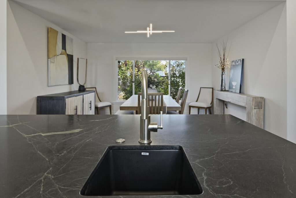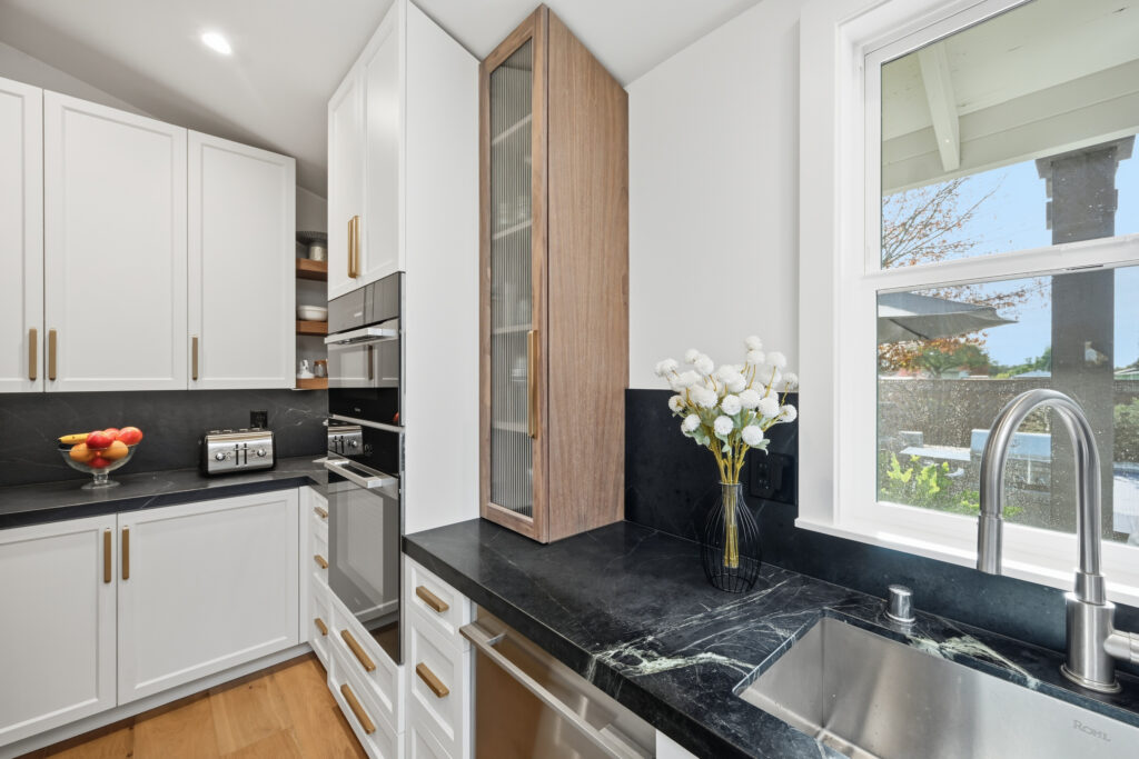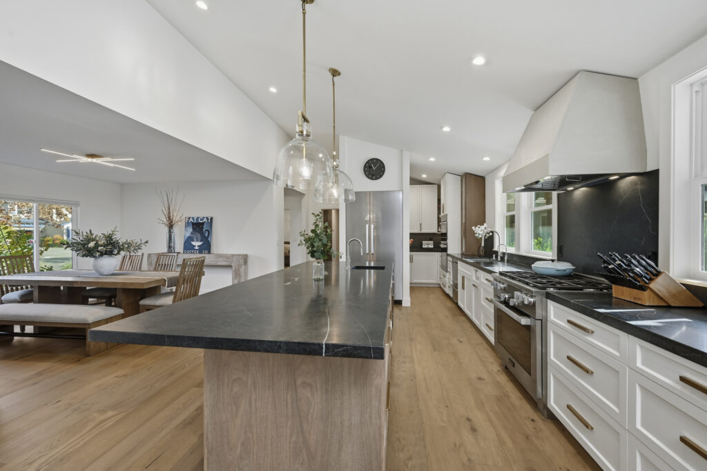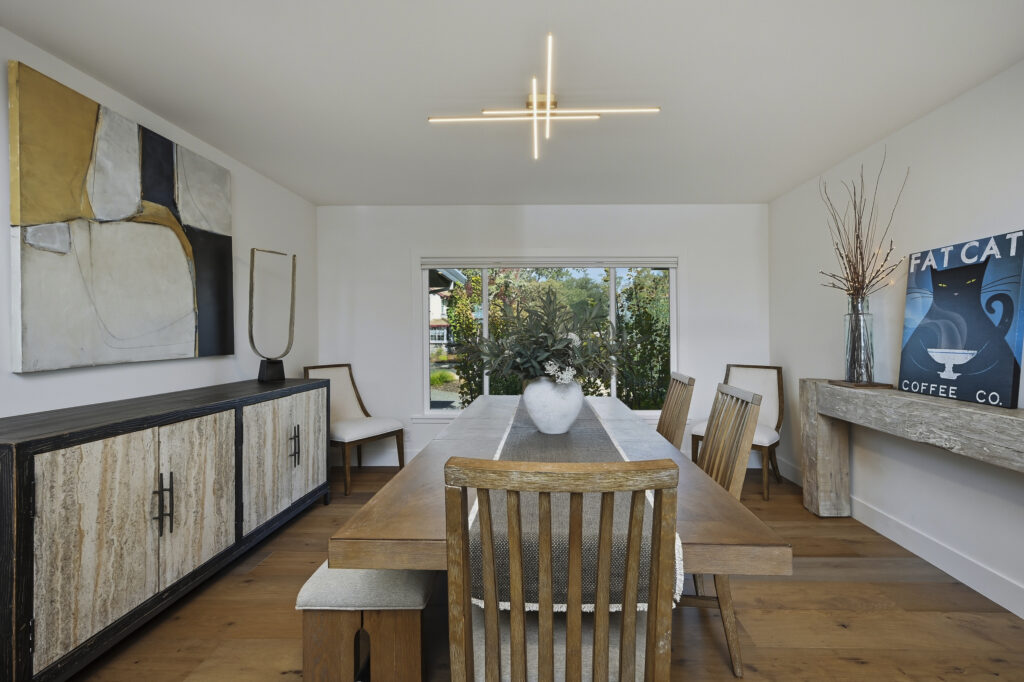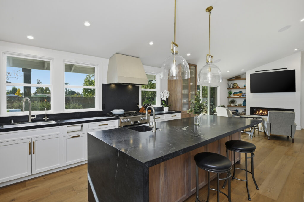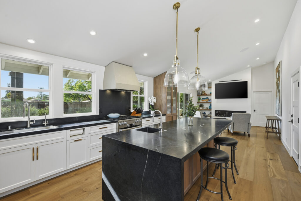 This Sonoma County remodel involved structural reconfiguration to improve interior flow and functionality, including lifting the ceiling. Interior walls were removed to create an open living, dining and entertaining area, and new framing was added to establish a dedicated entry.