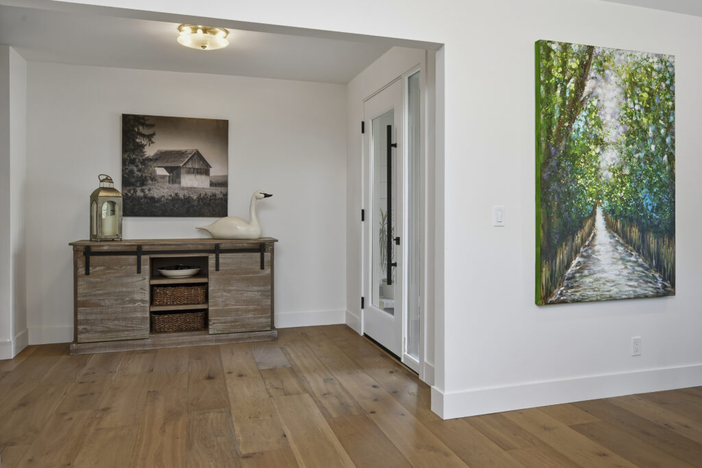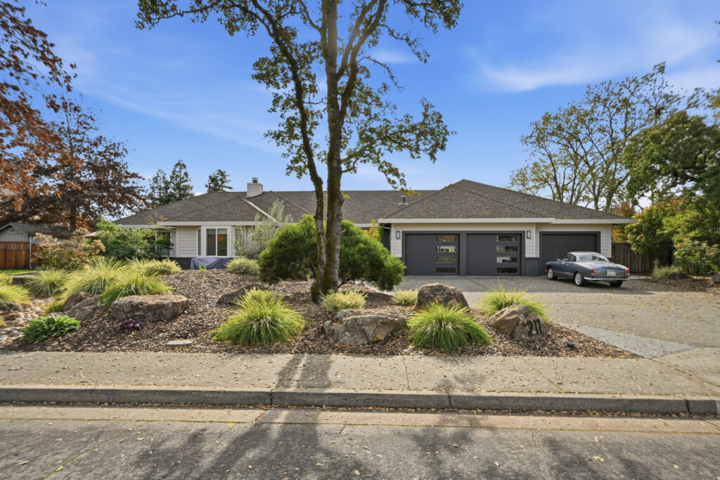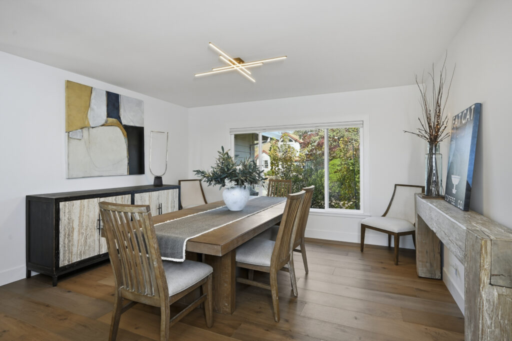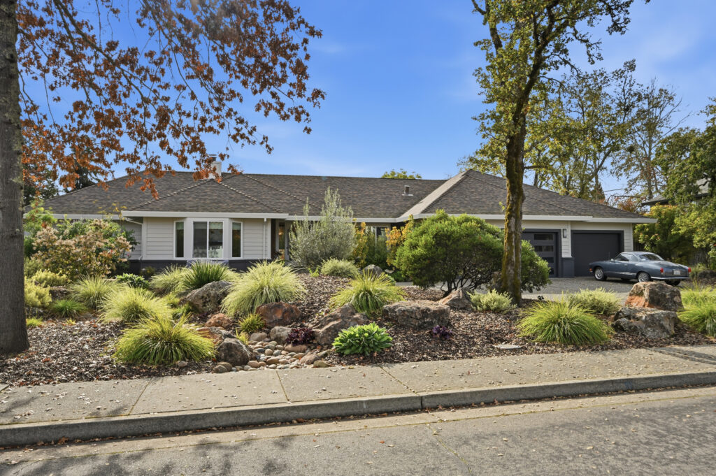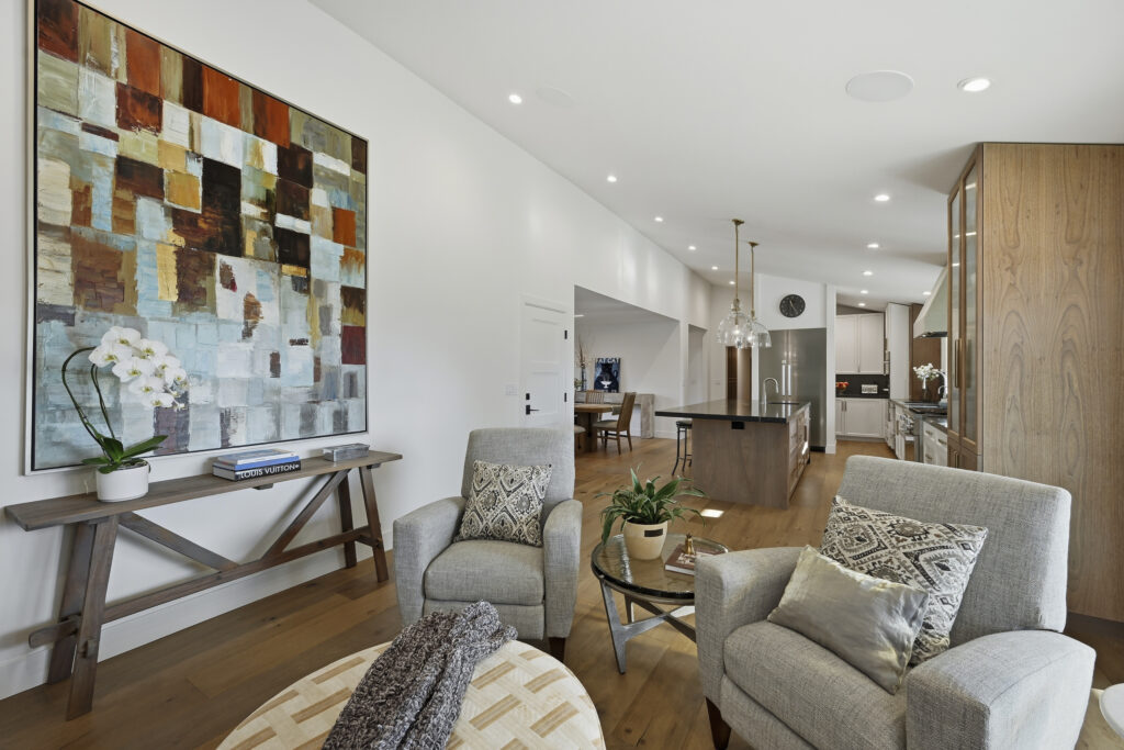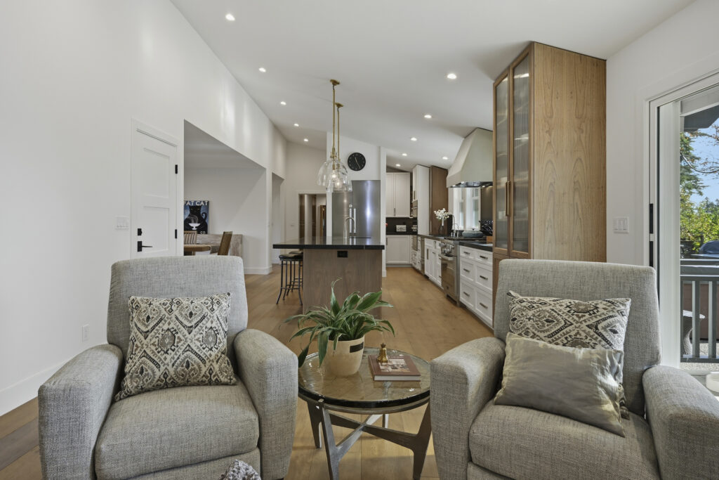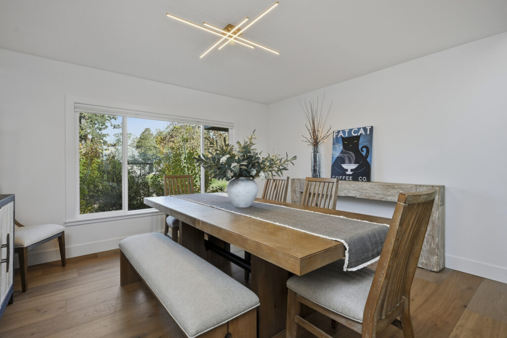 This Sonoma County remodel involved structural reconfiguration to improve interior flow and functionality, including lifting the ceiling. Interior walls were removed to create an open living, dining and entertaining area, and new framing was added to establish a dedicated entry.
