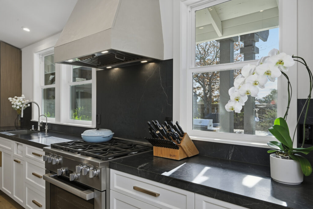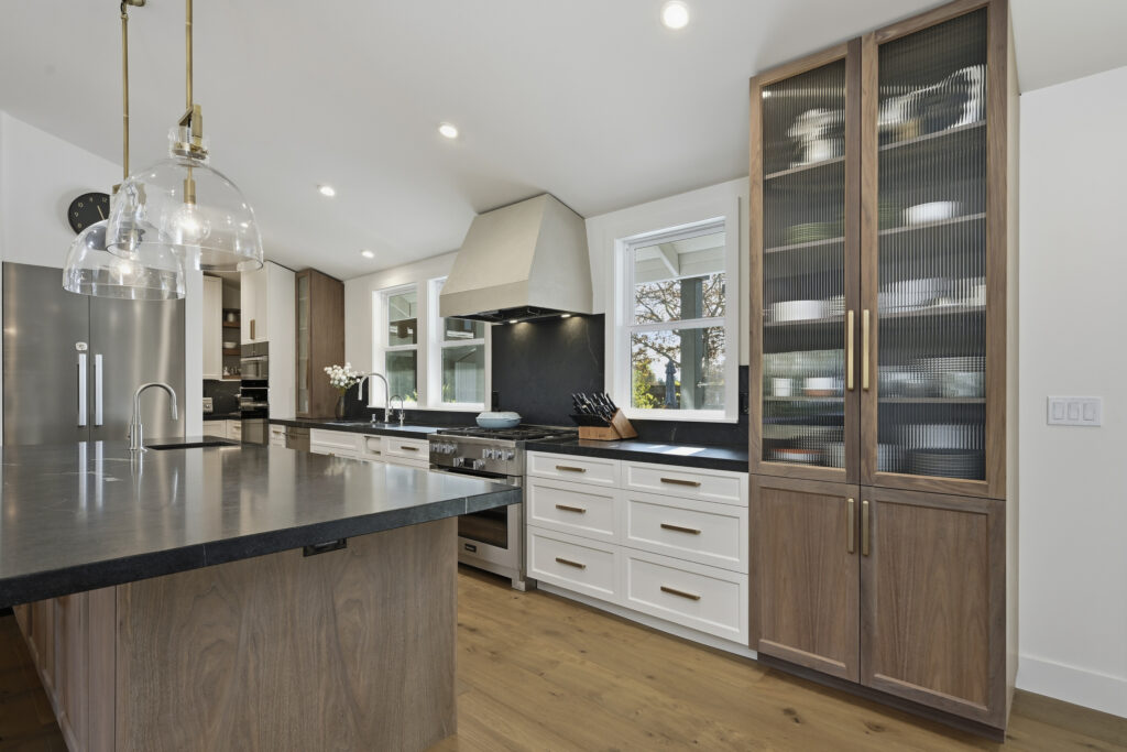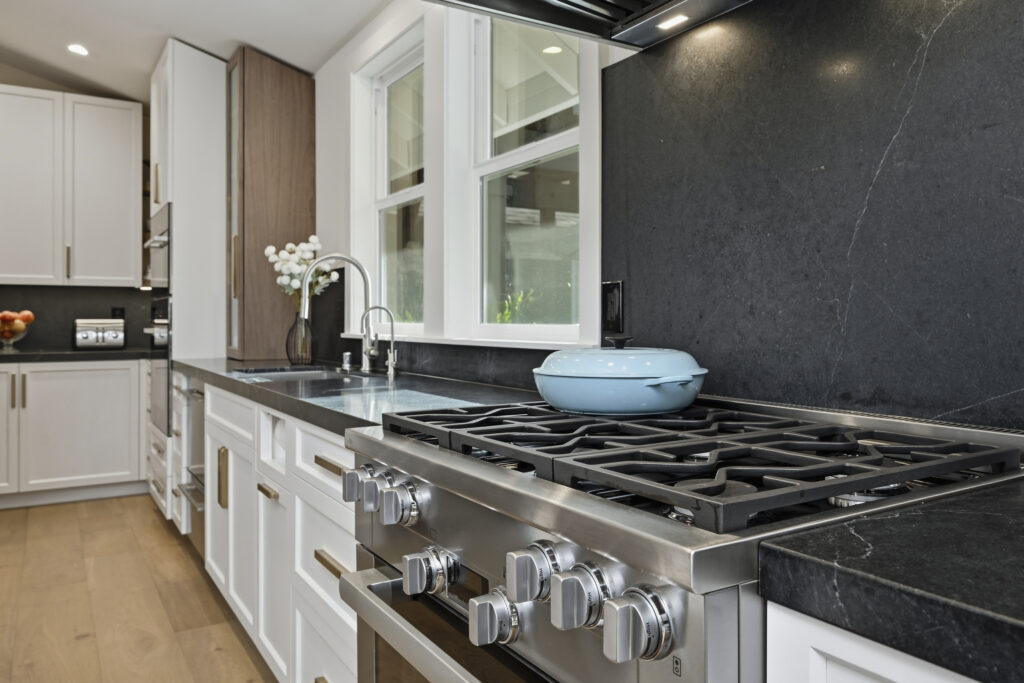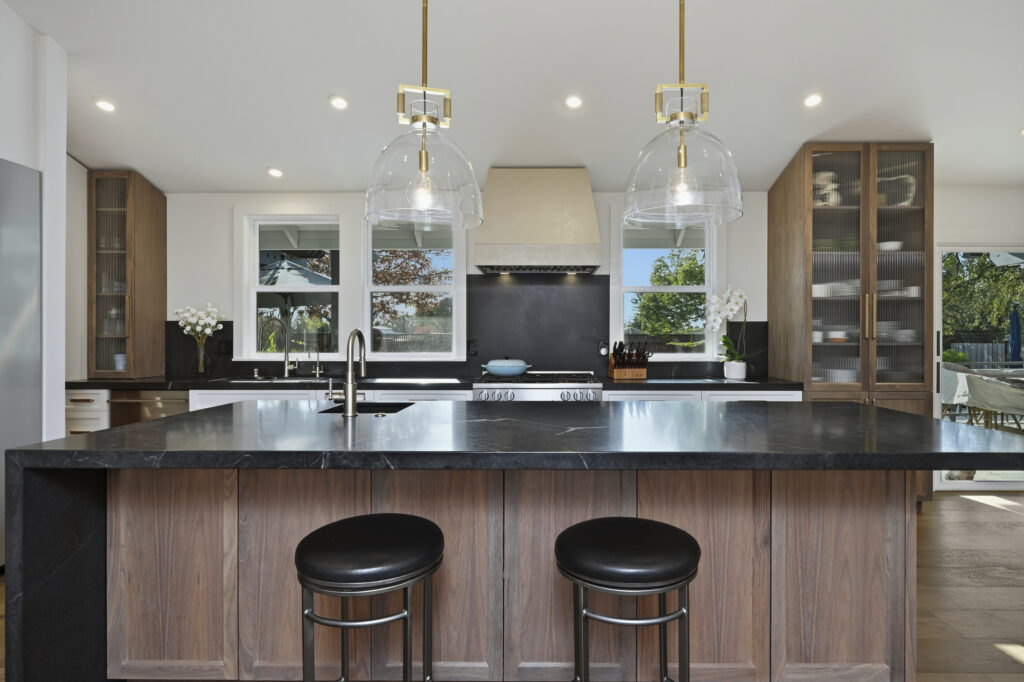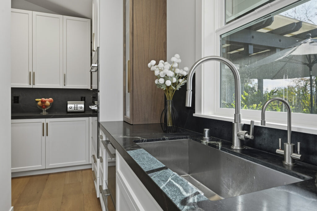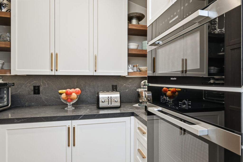 The kitchen was built with integrated appliances, a custom plaster hood, and a combination of walnut and painted cabinetry. Furniture-style cabinets were constructed for additional storage. Soapstone countertops were installed for durability and long-term performance. A concealed mini “messy kitchen” was built adjacent to the kitchen to contain messes and support everyday use without impacting primary living spaces.